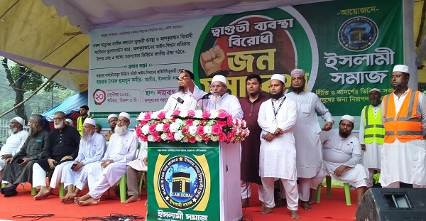 ‘ইসলামী সমাজ’ ঢাকা বিভাগীয় অঞ্চল-২ এর সহকারী দায়িত্বশীল, আকিক হাবিবুজ্জামানের সভাপতিত্বে “সকল মানুষের সার্বিক কল্যাণে ত্বাগুতী ব্যবস্থা ও আলকুরআন বিরোধী সংবিধান মূলোৎপাটন করে আলকুরআনের আইন-বিধান প্রতিষ্ঠার উপায় এবং এ লক্ষ্যে মহাসত্যের ভিত্তিতে জাতীয় ঐক্য গঠনে” অনুষ্ঠিত ত্বাগুতী ব্যবস্থা বিরোধী জনসমাবেশে সংগঠনের আমীর সৈয়দ হুমায়ূন কবীর বলেন, আল্লাহর রাসুল হযরত মুহাম্মাদ (সাঃ) এর প্রদর্শিত পদ্ধতিতে ত্বাগুতী ব্যবস্থা গণতন্ত্রের ভিত্তিতে রচিত আলকুরআন বিরোধী সংবিধানের মূলোৎপাটন করে আলকুরআনের আইন-বিধান দিয়ে সমাজ ও রাষ্ট্র গঠিত এবং পরিচালিত হলে সকল মানুষের সকল ন্যায্য অধিকার আদায় ও সংরক্ষণ হবে, সকল ধর্মের লোক শান্তিপূর্ণভাবে যার যার ধর্ম পালন করতে পারবে এবং জাতি, ধর্ম নির্বিশেষে সকল মানুষের জান ও মালের নিরাপত্তা নিশ্চিত হবে, দুর্নীতি ও বৈষম্যমুক্ত ইনসাফ ভিভিক কল্যাণকর সমাজ ও রাষ্ট্র গঠিত হবে। তিনি বলেন, যারা আল্লাহর রাসূল হযরত মুহাম্মাদ (সা:) এর প্রদর্শিত পদ্ধতিতে আলকুরআনের আইন-বিধান প্রতিষ্ঠার চূড়ান্ত প্রচেষ্টা চালিয়ে যেতে থাকবে তারা আল্লাহর ক্ষমা লাভকরে জান্নাতবাসী হবে।