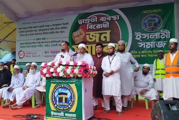 নিজস্ব প্রতিনিধি :শনিবার ২০ সেপ্টেম্বর ২০২৫ শাহবাগে ‘ইসলামী সমাজ’ কর্তৃক আয়োজিত ত্বাগুতী ব্যবস্থা বিরোধী জনসমাবেশে প্রধান বক্তার বক্তব্যে ইসলামী সমাজের আমীর হজরত সৈয়দ হুমায়ূন কবীর বলেছেন- মানুষের প্রয়োজন ও কল্যাণেই সমাজ ও রাষ্ট্র। সমাজ ও রাষ্ট্রের মূল বিষয় সার্বভৌমত্ব। সমাজ ও রাষ্ট্রের ক্ষেত্রে সার্বভৌমত্ব হচ্ছে সমাজ ও রাষ্ট্রের মালিকানা এবং আইন-বিধান প্রণয়ন ও প্রয়োগের সর্বোচ্চ ক্ষমতা। গণতন্ত্রসহ সকল প্রকার মানব রচিত ব্যবস্থায় সমাজ ও রাষ্ট্র গঠন এবং পরিচালনায় সার্বভৌমত্ব, আইন-বিধান ও শাসন- কর্তৃত্ব এবং দাসত্ব ও আইনের আনুগত্য সৃষ্টিকর্তা আল্লাহর পরিবর্তে মানুষের। সুতরাং, মানব রচিত সকল ব্যবস্থাই আল্লাহ রাব্বুল আলামীনের সার্বভৌমত্ব, আইন-বিধান ও নিরংকুশ শাসন-কর্তৃত্ব এবং আইন-বিধানের আনুগত্যের সীমালঙ্ঘনকারী ব্যবস্থা- ত্বাগুতী ব্যবস্থা। বাংলাদেশসহ বিশ্বের মানুষ কোন না কোন ত্বাগুতী ব্যবস্থার অধীনে বন্দি হয়ে মহা বিপর্যয়ের মুখোমুখী অবস্থান করছে। দেশের বিভিন্ন প্রান্ত থেকে সমাগত হওয়া হাজার হাজার নারী-পুরুষসহ দেশ ও বিশ্বাবাসীর উদ্দেশ্যে তিনি বলেন, দেশ ও জাতির মানুষ ত্বাগুতী ব্যবস্থা গণতন্ত্র ও গণতেন্ত্রর ভিত্তিতে রচিত আলকুরআন বিরোধী সংবিধান মেনে চলার মাধ্যমে সমাজ ও রাষ্ট্র গঠন এবং পরিচালনায় আল্লাহর পরিবর্তে মানুষকে রব ও ইলাহ্ গ্রহণ করে মহান রবের সাথে কুফর এবং শিরকে লিপ্ত হয়ে তাঁরই ভয়াবহ আযাব-গজবের মুখোমুখী অবস্থান করছে এবং তাদের আখিরাতের জীবনও ধ্বংস হচ্ছে। আযাব-গজব এবং আখিরাতে ধ্বংস থেকে বাঁচার একমাত্র পথ হচ্ছে ইসলাম এবং আলকুরআন’ই মানব জাতির জন্য একমাত্র কল্যাণকর ও পরিপূর্ণ সংবিধান । ‘ইসলামী সমাজ’ ঢাকা বিভাগীয় অঞ্চল-২ এর সহকারী দায়িত্বশীল, আকিক হাবিবুজ্জামানের সভাপতিত্বে “সকল মানুষের সার্বিক কল্যাণে ত্বাগুতী ব্যবস্থা ও আলকুরআন বিরোধী সংবিধান মূলোৎপাটন করে আলকুরআনের আইন-বিধান প্রতিষ্ঠার উপায় এবং এ লক্ষ্যে মহাসত্যের ভিত্তিতে জাতীয় ঐক্য গঠনে”- অনুষ্ঠিত ত্বাগুতী ব্যবস্থা বিরোধী জনসমাবেশে সংগঠনের আমীর সৈয়দ হুমায়ূন কবীর বলেন, আল্লাহর রাসূল হযরত মুহাম্মাদ (সা:) এর প্রদর্শিত পদ্ধতিতে ত্বাগুতী ব্যবস্থা গণতন্ত্রের ভিত্তিতে রচিত আলকুরআন বিরোধী সংবিধানের মূলোৎপাটন করে আলকুরআনের আইন-বিধান দিয়ে সমাজ ও রাষ্ট্র গঠিত এবং পরিচালিত হলে সকল মানুষের সকল ন্যায্য অধিকার আদায় ও সংরক্ষণ হবে, সকল ধর্মের লোক শান্তিপূর্ণভাবে যার যার ধর্ম পালন করতে পারবে এবং জাতি, ধর্ম নির্বিশেষে সকল মানুষের জান ও মালের নিরাপত্তা নিশ্চিত হবে, দুর্নীতি ও বৈষম্যমুক্ত ইনসাফ ভিত্তিক কল্যাণকর সমাজ ও রাষ্ট্র গঠিত হবে। তিনি বলেন, যারা আ
