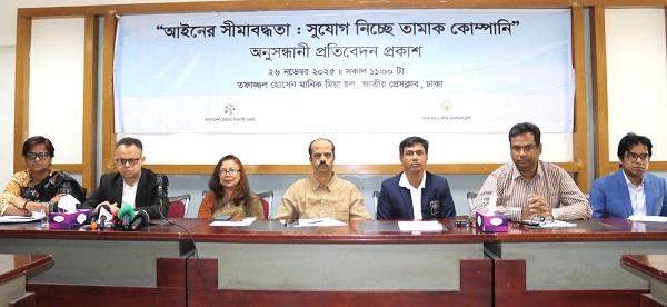 আজ ২৬ নভেম্বর ২০২৫, সকালে জাতীয় প্রেস ক্লাবের “তফাজ্জল হোসেন মানিক মিয়া” হলে বাংলাদেশ তামাক বিরোধী জোট ও ডাব্লিউবিবি ট্রাস্ট এর যৌথ উদ্যোগে “আইনের সীমাবদ্ধতা: সুযোগ নিচ্ছে তামাক কোম্পানি” শীর্ষক অনুসন্ধানী প্রতিবেদন প্রকাশ অনুষ্ঠানে আলোচকগণ এ অভিমত ব্যক্ত করেন। এতে গণমাধ্যমকর্মীদের অনুসন্ধানী প্রতিবেদন উপস্থাপন করা হয়। তামাক কোম্পানির হস্তক্ষেপের তথ্য তুলে বিষয়ে বিগত তিন মাস অনুসন্ধান করেন ঢাকা ট্রিবিউন ও বাংলা ট্রিবিউনের খুলনার প্রতিনিধি মোঃ হেদায়েৎ হোসেন মোল্লা এবং সারাবাংলা ডটনেট এর সিনিয়র করেসপন্ডেন্ট এমদাদুল হক তুহিন। প্রতিবেদনে তরূনদেরকে সিগারেটে আসক্ত করতে সিগারেট কোম্পানিগুলোর আইন লংঘন এবং নীতিতে হস্তক্ষেপের তথ্য উঠে এসেছে। পাশাপাশি গণমাধ্যমকর্মীদের পক্ষ থেকে দ্রুত তামাক নিয়ন্ত্রণ আইন সংশোধন করে শক্তিশালী করার আহবান জানানো হয়।