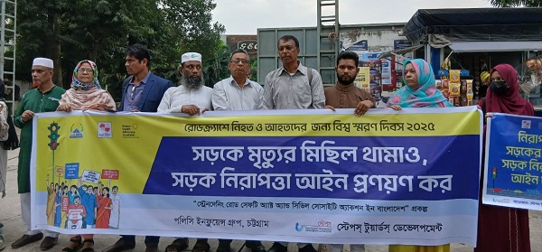 রোড় ক্রাশে নিহত ও আহতদের জন্য বিশ্ব স্মরণ দিবস ২০২৫ উদাপযন উপলক্ষে “সড়কে মৃত্যুর মিছিল থামাও, সড়ক নিরাপত্তা আইন প্রণয়নের দাবিতে” চট্টগ্রামে বেসরকারী উন্নয়ন সংগঠন স্টেপস টুয়ার্ডস ডেভেলপমেন্ট, পলিসি ইনফ্লুয়েন্স গ্রুপ-চট্টগ্রাম ও ক্যাব চট্টগ্রামের উদোগে মানববন্ধন ০২ ডিসেম্বর ২০২৫ইং বিকাল ৩.৪৫মিনিটে চট্টগ্রামে নগরীর জিইসি কনভেনশনের হলের সামনে অনুষ্টিত হয়। পলিসি ইনফ্লুয়েন্স গ্রুপ চট্টগ্রামের সভাপতি বিশিষ্ট কলামিস্ট মুহাম্মদ মুসা খানের সভাপতিত্বে ও আইএসডিই এর কর্মসুচি কর্মকর্তা রাইসুল ইসলামের সঞ্চালনায় সংহতি জানিয়ে বক্তব্য রাখেন ক্যাব কেন্দ্রিয় কমিটির ভাইস প্রেসিডেন্ট এস এম নাজের হোসাইন, বিশিষ্ট নারী নেত্রী ও ক্যাব চট্টগ্রাম মহানগরের সভাপতি জেসমিন সুলতানা পারু, ক্যাব বিভাগীয় সাধারন সম্পাদক কাজী ইকবাল বাহার ছাবেরী, বিশিষ্ট মানবাধিকার কর্মী রোটারিয়ান এস এম আজিজ, ক্যাব চট্টগ্রাম মহানগরের সাংগঠনিক সম্পাদক জান্নাতুল ফেরদৌস, ক্যাব চট্টগ্রাম মহানগরের যুগ্ন সম্পাদক মোহাম্মদ সেলিম জাহাঙ্গীর, জেলা সামাজিক উদ্যোক্তা পরিষদের যুগ্ন সম্পাদক মোহাম্মদ জানে আলম, ‍উন্নয়ন কর্মী ইয়াছিন মঞ্জু, সুবজের যাত্রার নির্বাহী পরিচালক সায়েরা বেগম, প্রত্যয় সোস্যাল ডেভেলপমেন্ট এর নাজমুল ইসলাম, বাংলাবন্ধু যাত্রী কল্যান সংস্থার আকতার হোসেন রানা, যুব ক্যাব চট্টগ্রাম মহানগরের সভাপতি আবু হানিফ নোমান, সদস্য ফয়েজ আহমদ, করিমুল ইসলাম, মোঃ সালমান রশীদ অভি প্রমুখ। দিবসের ধারনা পত্র পাঠ করেন রাসেল উদ্দীন।