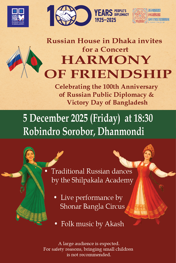 নিজস্ব প্রতিনিধি :ঢাকার রাশিয়ান হাউস “বন্ধুত্বের সম্প্রীতি: রাশিয়ান পাবলিক কূটনীতির ১০০তম বার্ষিকী উদযাপন এবং বাংলাদেশের বিজয় দিবস” শীর্ষক একটি উৎসবমুখর সাংস্কৃতিক অনুষ্ঠান ঘোষণা করতে পেরে আনন্দিত। এই উদযাপন ৫ ডিসেম্বর ২০২৫ (শুক্রবার) বিকাল ৫:৩০ টায় ধানমন্ডির রবিন্দ্রো সোরোবরে অনুষ্ঠিত হবে।