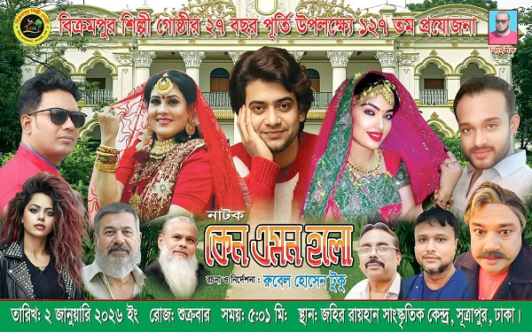 মো.তারেক হোসেন বাপ্পি:রাজধানীর পুরান ঢাকায় জহির রায়হান সাংস্কৃতিক কেন্দ্রে (লোহারপুল) ২রা জানুয়ারি শুক্রবার বিকেলে বিক্রমপুর শিল্পী গোষ্ঠীর ২৭ বছর পূর্তি উপলক্ষে ১২৭তম প্র‍য়াস সংক্ষিপ্ত আলোচনা ও নাট্যানুষ্ঠান “কেন এমন হলো” অনুষ্ঠিত হতে যাচ্ছে।