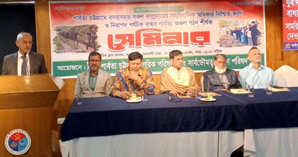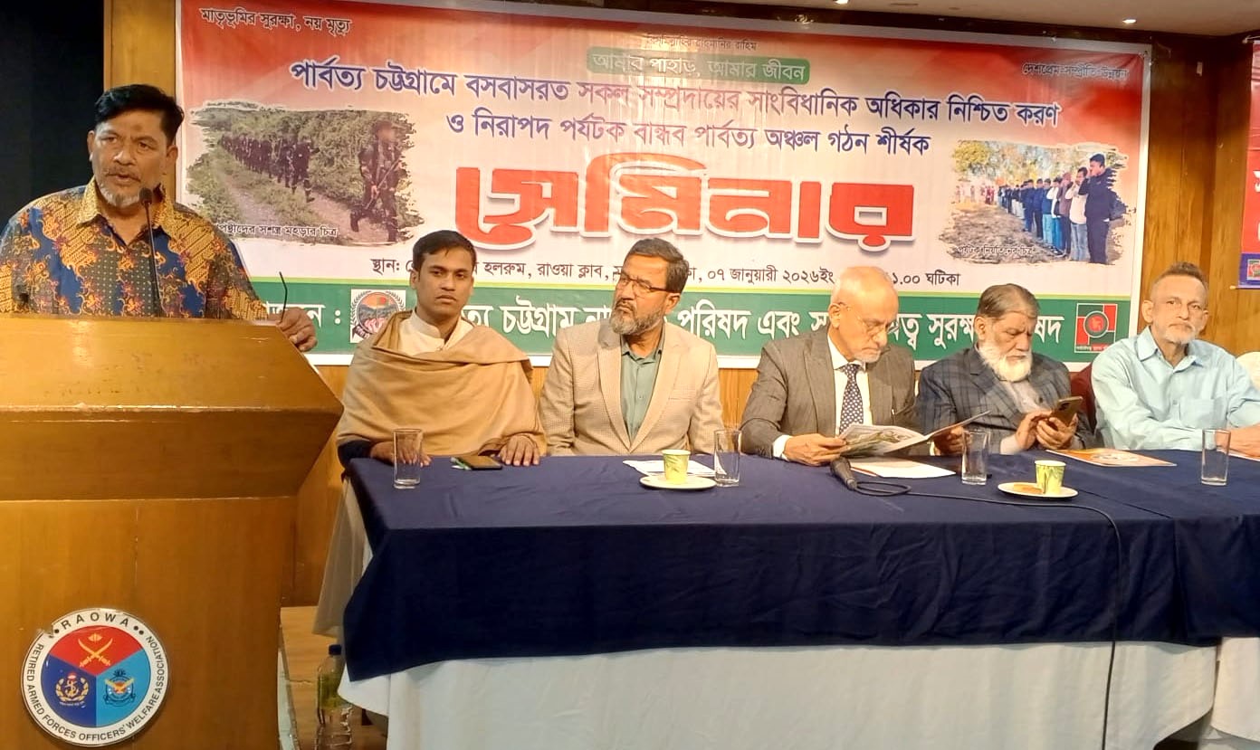 নিজস্ব প্রতিনিধিঃ পার্বত্য চট্টগ্রামের সার্বভৌমত্ব, নিরাপত্তা ও পর্যটনবান্ধব পরিবেশ বজায় রাখার পাশাপাশি পার্বত্য অঞ্চলের বাসিন্দাদের সাংবিধানিক অধিকার নিশ্চিত করার লক্ষ্যে রাজধানীর রাওয়া ক্লাবে একটি সেমিনার অনুষ্ঠিত হয়েছে।