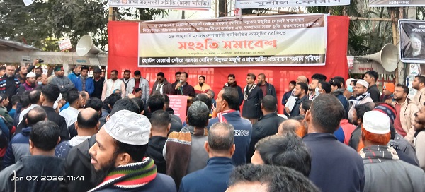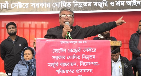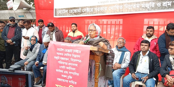 ২৪ সালে আন্দোলন-সংগ্রামের মধ্য দিয়ে বর্তমান সরকার ক্ষমতাসীন হওয়ার মধ্য দিয়ে প্রত্যাশা করা হয়েছিল, বিগত সরকারের মত এই সরকার আচরণ করবে না। কিন্তু দেখা যাচ্ছে এই সরকারও বিগত সরকারের মতই আচরণ করছে, শ্রমিকদের দাবি-দাওয়ার প্রেক্ষিতে উদ্যোগ নিচ্ছে না। ৫ মে নিম্নতম মজুরির গেজেট ঘোষণা হলেও অদ্যাবধি তা বাস্তবায়ন হচ্ছে না”। স্কপ নেতা প্রকাশ দত্ত সমাবেশে সংহতি জানিয়ে বলেন, “ ভেনিজুয়েলা প্রেসিডেন্টকে মার্কিন সৈন্যরা কিডন্যাপ করে নিয়ে গিয়েছে, এ নিয়ে সারা বিশে^ প্রতিবাদ হচ্ছে। আশা করব হোটেল শ্রমিকরাও এই প্রতিবাদে শামিল হবে। আজকে বাংলাদেশকে আমেরিকার যুদ্ধ পরিকল্পনায় ঠেলে দেয়া হচ্ছে। এর বিরুদ্ধে সমস্ত শ্রমিক যখন রাস্তায় নামবে তখন ভালুকায় শ্রমিক হত্যা করে পরিচয় দেয়া হচ্ছে হিন্দু শ্রমিক। এইভাবে একদিকে সাম্প্রদায়িকতা এবং অন্যদিকে মুক্তিযুদ্ধের নামে উগ্রজাতীয়তাবাদের খেলা চলছে।