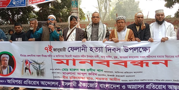 নিজস্ব প্রতিনিধিঃ আধিপত্য প্রতিরোধ আন্দোলন, ইসলামী ঐক্যজোট বাংলাদেশ ও আগ্রাসন প্রতিরোধ আন্তর্জাতিক আন্দোলনের যৌথ উদ্যোগে “৭ই জানুয়ারি ফেলানী হত্যা দিবস” উপলক্ষে ৭ই জানুয়ারি, ২০২৬, বুধবার সকাল ১১টায় জাতীয় প্রেসক্লাবের সামনে “শহীদ ফেলানীসহ সকল সীমান্ত হত্যা ও আধিপত্যবাদী হত্যার বিচারের দাবীতে মানববন্ধন” অনুষ্ঠিত হয়।