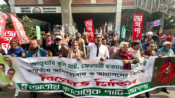 আজ ৭ জানুয়ারি বুধবার সকালে ফেলানী হত্যা দিবস উপলক্ষে রাজধানীর বিজয়নগর-পল্টন এলাকায় ভারতীয় আধিপত্যবাদ ও আগ্রাসন বিরোধী জাগপা আয়োজিত বিক্ষোভ মিছিল শেষে প্রেসক্লাবের সামনে সংক্ষিপ্ত সমাবেশে তিনি এসব কথা বলেন। এসময় আরও বক্তব্য রাখেন জাগপা সাধারণ সম্পাদক অধ্যাপক ইকবাল হোসেন, প্রেসিডিয়াম সদস্য আসাদুর রহমান খান, সৈয়দ শফিকুল ইসলাম, সাংঠনিক সম্পাদক মো: নাসির উদ্দিন, যুব জাগপা সভাপতি নজরুল ইসলাম বাবলু, সাংগঠনিক সম্পাদক ওলিউল আনোয়ার প্রমুখ।