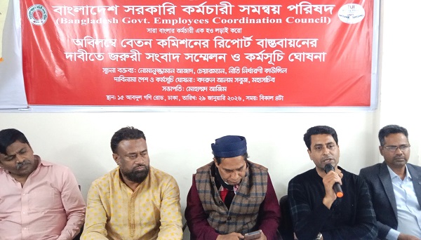 নিজস্ব প্রতিনিধিঃনবম পে-স্কেল এর গ্যাজেট প্রকাশের দাবীতে বাংলাদেশ সরকারি কর্মচারী সমন্বয় পরিষদ সংবাদ সম্মেলন অনুষ্ঠিত হয়। ২৮-০১-২০২৬ বৃহস্পতিবার বিকাল ৩ টায় ১৫ আবদুল গণি রোড, ঢাকা সংগঠনের কার্যালয় সংবাদ সম্মেলন অনুষ্ঠিত হয়। সংবাদ সম্মেলনে লিখিত বক্তব্য পাঠ করেন সংগঠনের মহাসচিব বদরুল আলম সবুজ। সংবাদিকদের বিভিন্ন প্রশ্নের উত্তর দেন নোমানুজ্জামান আল আজাদ।
