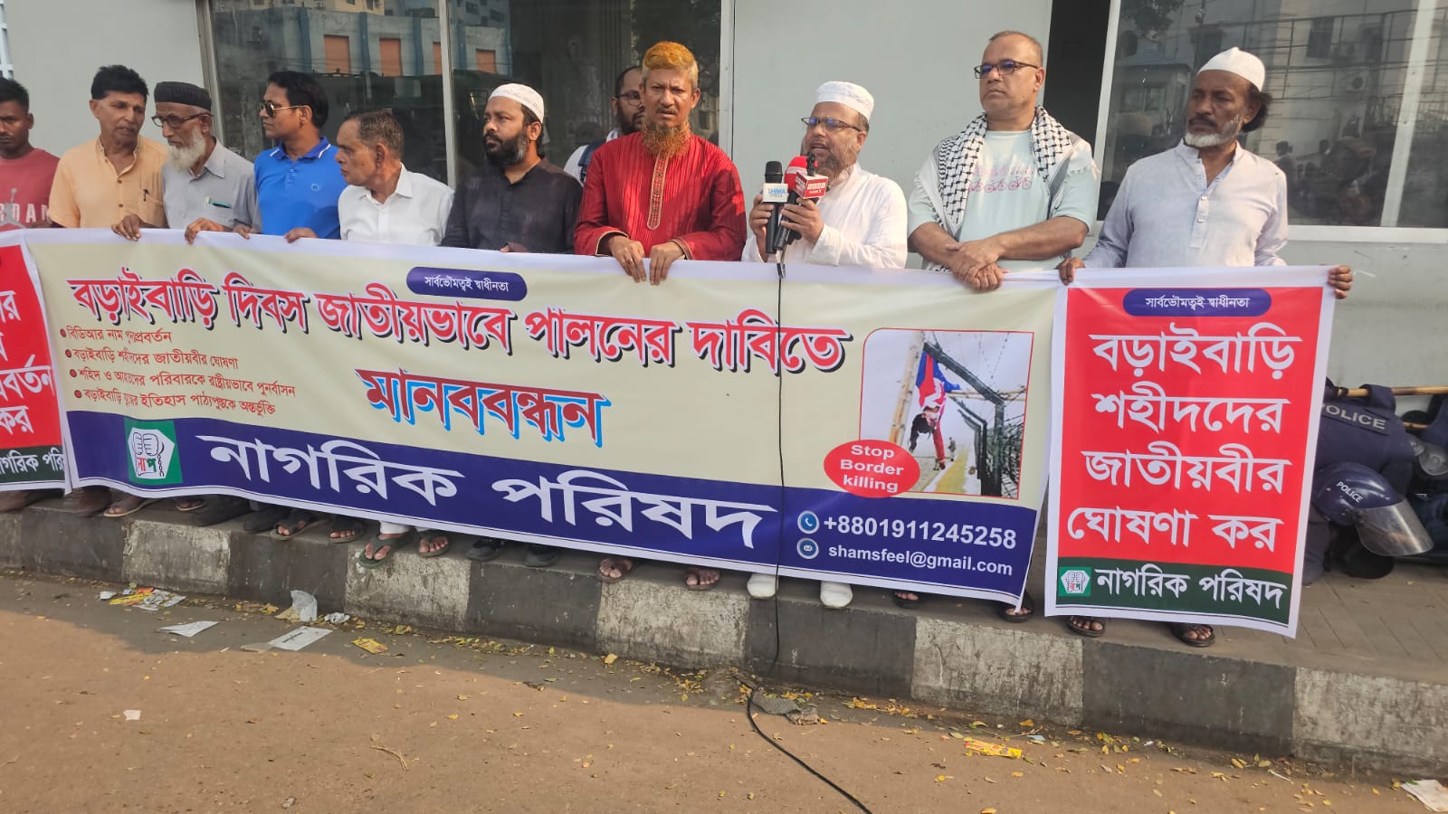 বড়াইবাড়ি দিবস জাতীয়ভাবে উদযাপনের দাবিতে অনুষ্ঠিত মানববন্ধন থেকে নাগরিক পরিষদের আহ্বায়ক মোহাম্মদ শামসুদ্দীন অনতিবিলম্বে বিডিআর নাম পুনঃপ্রবর্তনের দাবি জানিয়েছেন।